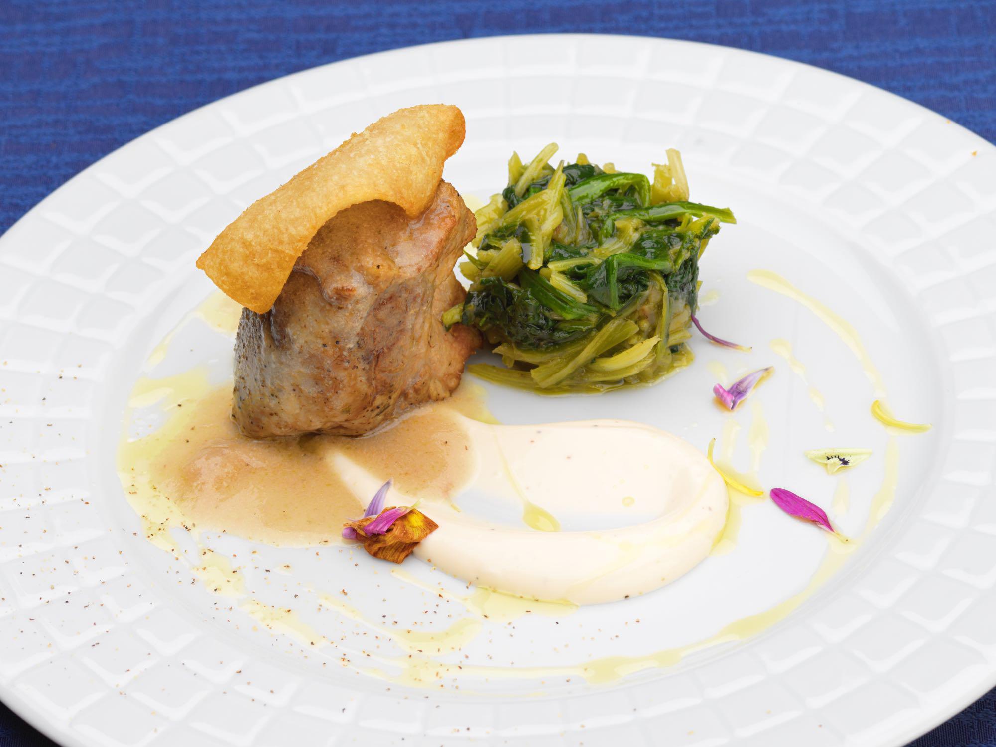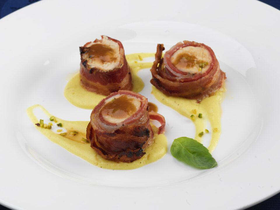 Polletto alla birra, bardato di pancetta con crema di papate allo zafferano