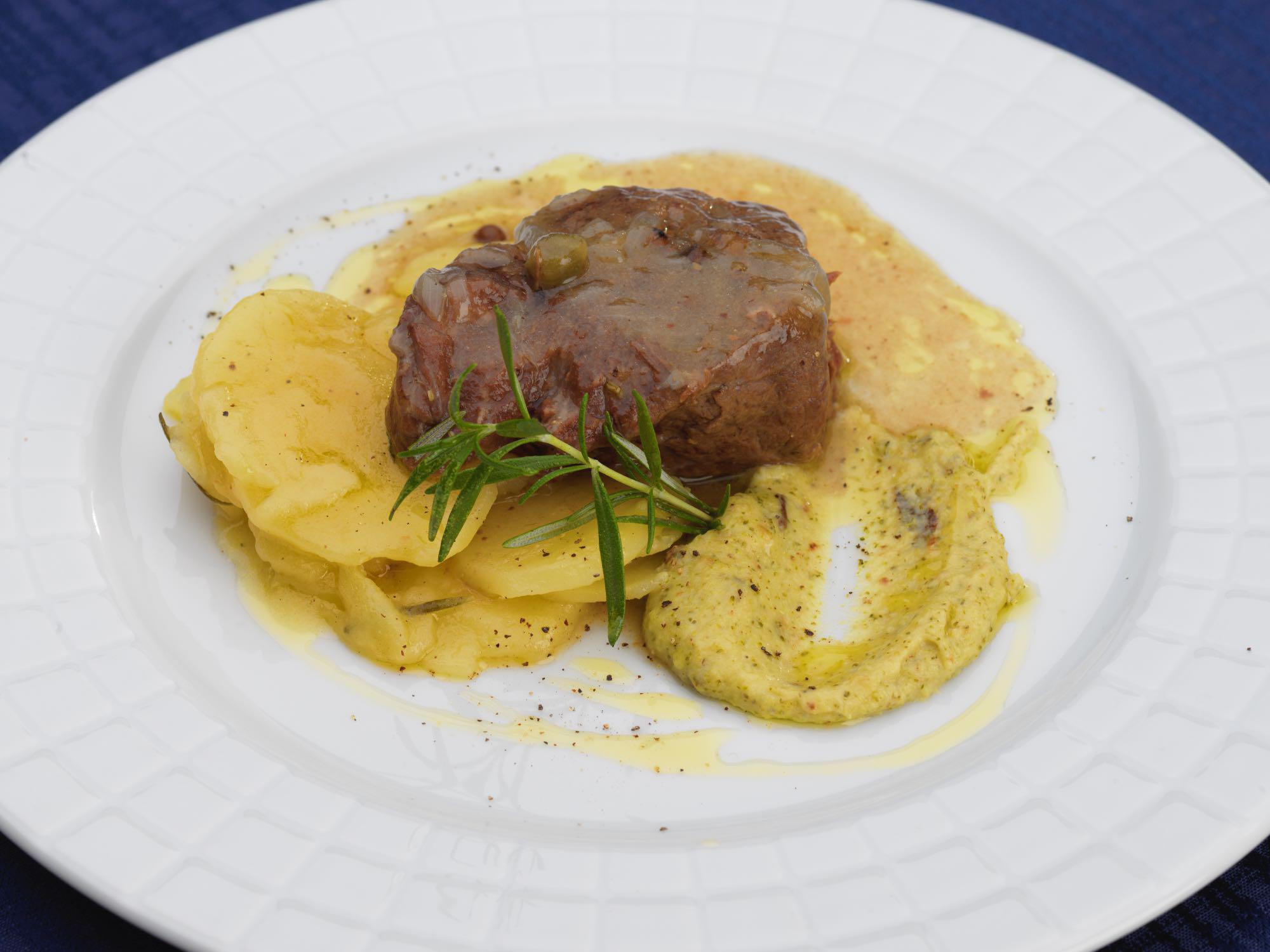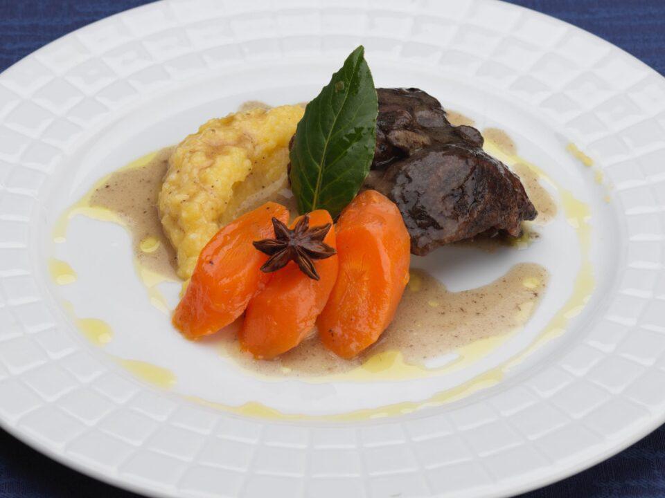 Guancia alla lacrima di Morro con patate mantecate, carote tornite al vapore