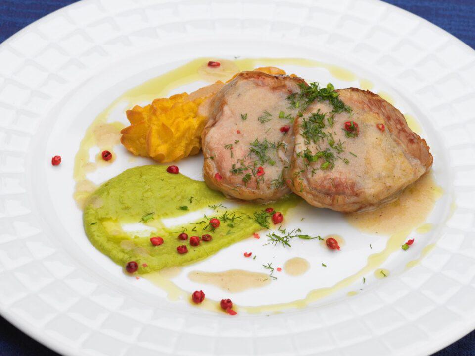 Filetto di maiale bardato in rete su patate duchessa e vellutata di zucchine